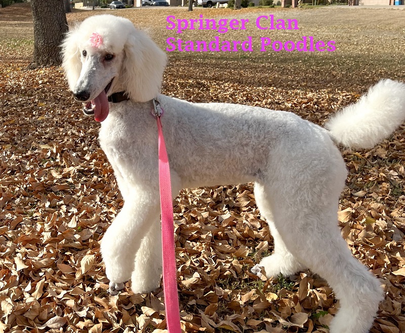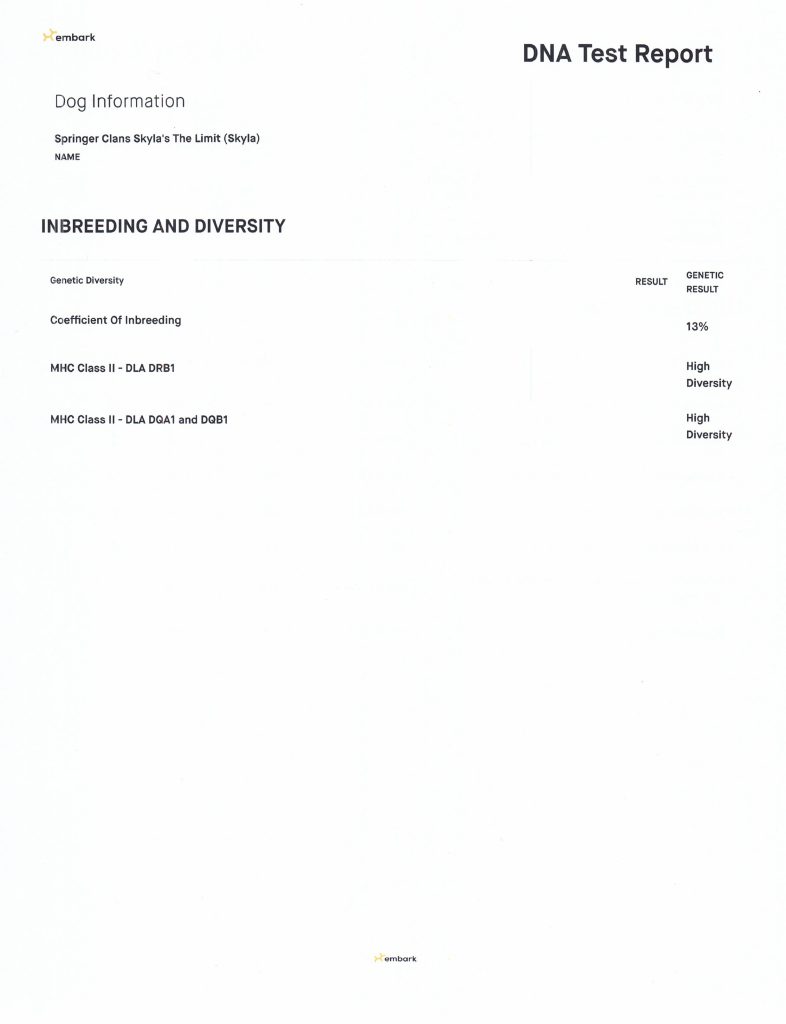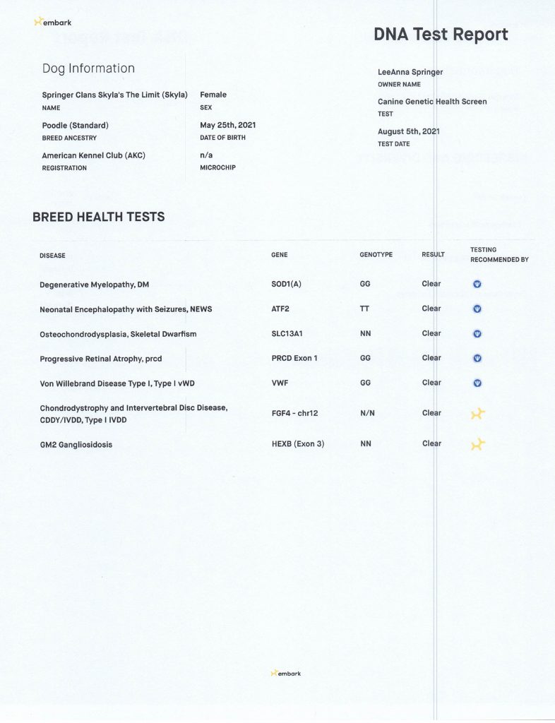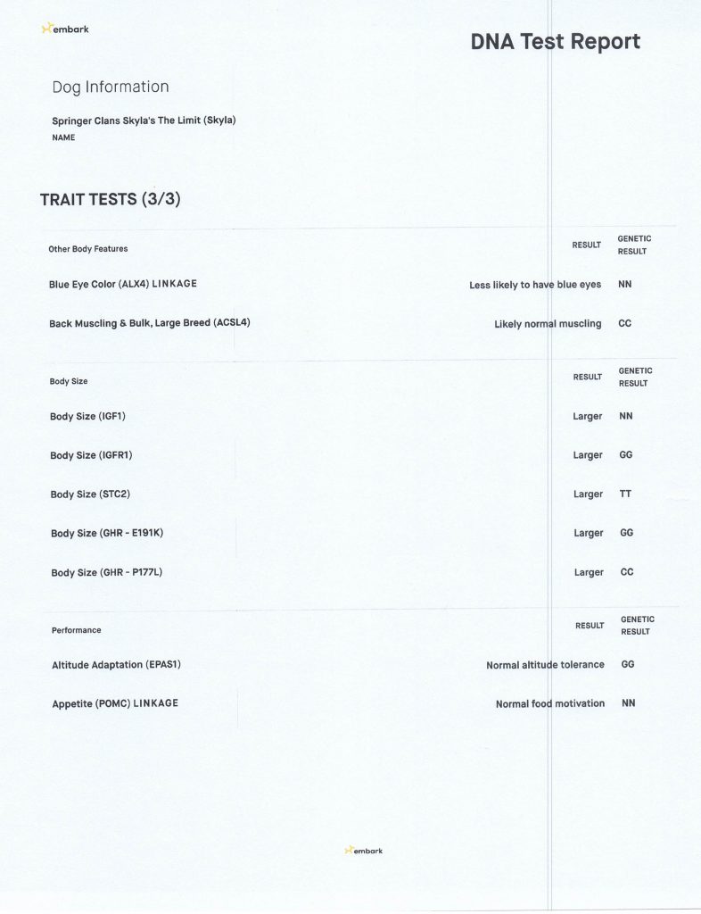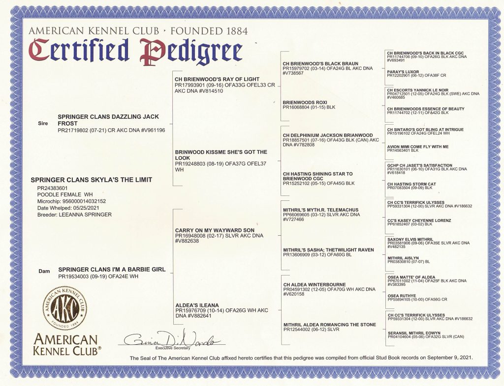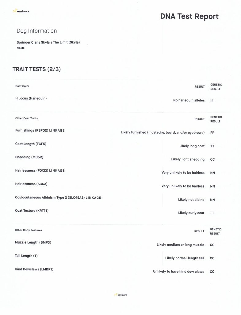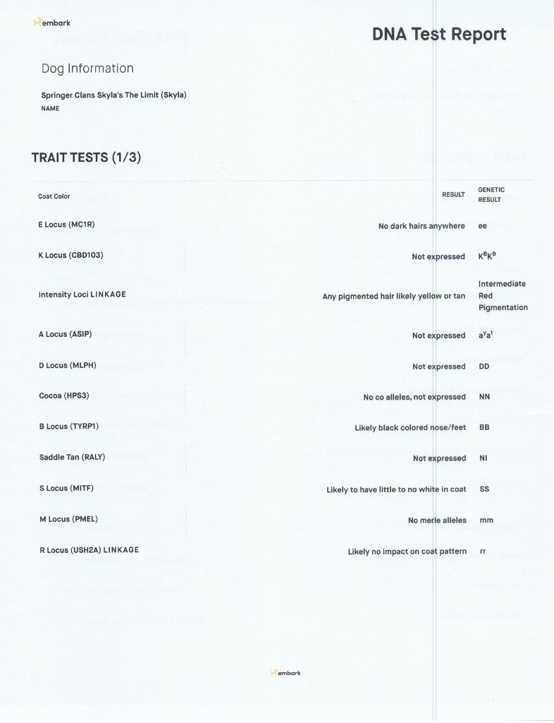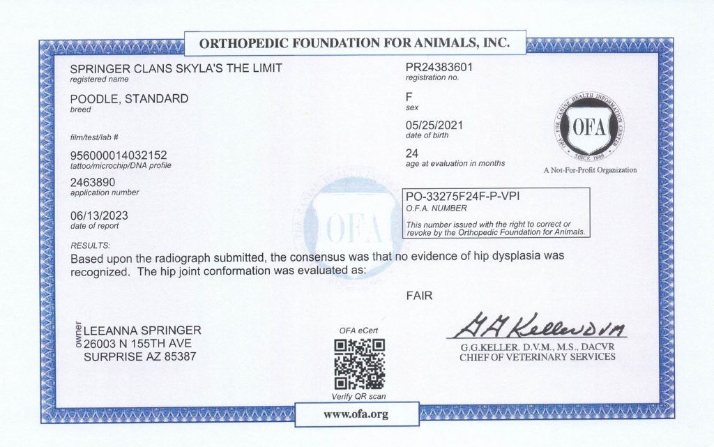 Skyla is a very easy going girl, she is sweet and loyal to her family. She lives here in the Valley with her Guardian Family. Skyla is out of Barbie and Jack who were both white, she carries for silver, blue, black, white, and cream. She is smaller in size, has a great coat, is well proportioned with an elegant face and tail set. She has completed her testing and is clear of testable genetic diseases and is OFA certified…see all below.